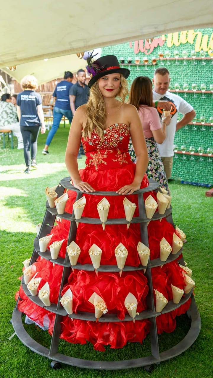 Make an unforgettable impression at your event with our Roaming Champagne Skirt Lady—a stunning and interactive way to serve welcome drinks, treats, or desserts. Designed to captivate your guests, our custom Champagne skirt holds up to 100 glasses and is fully customisable to match your event’s theme and colour scheme.